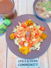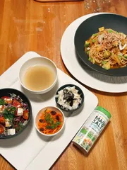 トマトガーリックのマカロニサラダに「パセリ🌿」 あえるだけパスタソースのトマトガーリックをマカロニに使いました。「パセリ」🌿美味しいついつい追加で追いパセリしましたよぉ〜 朝のルーティンドリンクも3種類入れて温活もバッチリ?!╰(*´︶`*)╯♡