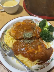 NEW ボリュームパスタ トマトソースのパスタ。もも肉がドーンと一枚丸々乗ってます✨仕上げにパセリをふりました。胃腸風邪から復活した夫、本当によく食べます。子供たちの食欲も復活して、うれしい悲鳴です。