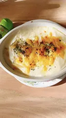 グラタン 今日は、久しぶりにグラタンをお昼に作りました。チキンとシーフードミックス入りです。チキンが少なかったので、冷凍庫のものを減らすのを兼ねて、シーフードミックスを入れました。チーズの上には、パセリで彩りを。