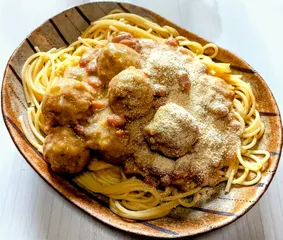 豆乳シチューのミートボールパスタ🫣 昨日のフェイジョンに鶏肉団子と豆乳、クミンパウダーを加えシチューにリメイクして🤗