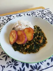 サグカレー 大豆ミートとホウレン草でサグにしましたクミン、コリアンダー、ターメリック、ガラムマサラを入れましたヨーグルト、トマトでコクと程よい酸味ホウレン草大量消費でき栄養たっぷり