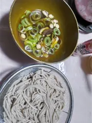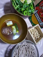 4種きのこの出汁の節分そば きのこ4種類を手動のみじん切り器でひたすら入念に挽いて、野菜スープを作りました。今日は特別にそのスープをめんつゆにして、お蕎麦を食べます。