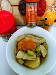 💠筍、じゃがいも、シーチキンの煮物 💠筍、じゃがいも、シーチキンの煮物母が良く作ってくれたおかず〜♡ (アレンジ)🔸筍水煮2個🔸じゃがいも小5個🔸シーチキンオイル缶大1個🔸こんにゃく1袋(手綱こんにゃくにする)🔸枝豆 20粒🔸砂糖 適量🔸オイスターソース 適量🔸鶏がらスープの素 小さじ1🔸コリアンダーパウダー 適量