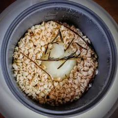 ぎゅうぎゅう焼きにローズマリー 鶏肉、れんこん、じゃがいも、にんじん、ブロッコリー、なす、かぶ、さつま芋、ピーマン、えりんぎ、ミニトマト…にローズマリーをのっけてオーブンで焼きました♪お腹はすいてるけど調理する元気がない時によく作る、切って並べたらオーブン任せの楽ちんぎゅうぎゅう焼きなんですが、ローズマリーの香りがごちそう過ぎて手