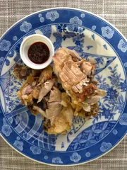 スパイシーで旨味たっぷりの炸鶏排 骨付き鶏胸肉、紹興酒大さじ2〜3、塩胡椒適量、五香粉適量、ニンニク2片、生姜小さじ2、醤油適量、コーンスターチ適量、花椒適量紹興酒に塩胡椒、ニンニク、醤油、生姜、五香粉、花椒を混ぜる。骨付き鶏胸肉にタレを塗りつけたらラップをしてしばらく置く。全体にコーンスターチを付け、揚げ色が付くまで揚げる。熱い内