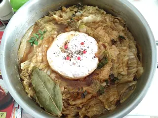 ミルフィーユカレーチーズ鍋 白菜と豚バラ肉を交互に重ねカットして鍋に敷き詰め水、自家製ローレルで煮込み柔らかくなったら出汁、醤油、みりん、赤缶カレーで味付けしカマンベールチーズを入れて味がなじむまで煮込み、ブラックペッパー、ピンクペッパー、乾燥オレガノ、生オレガノをかけ完成です食べるとき好みでガラムマサラをカマンベールチーズは