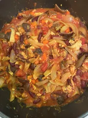 トマトカレー? 水なしで、トマト缶で作りました。ほんの少し辛さを感じるできあがりになりました。