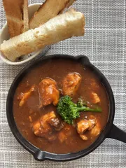スパイシーデミグラスソース煮込み 鶏もも肉80g、パン適量、デミグラスソース200g、カレー粉小さじ半分、ブラックペッパー適量、ガラムマサラ適量、塩適量フライパンで鶏もも肉を炒め、8割り位火を通す。スキレットにデミグラスソース、カレー粉、ガラムマサラ、ブラックペッパー、塩を入れ、鶏もも肉を加えて煮込む。食パンを焼いて付けながら食べる