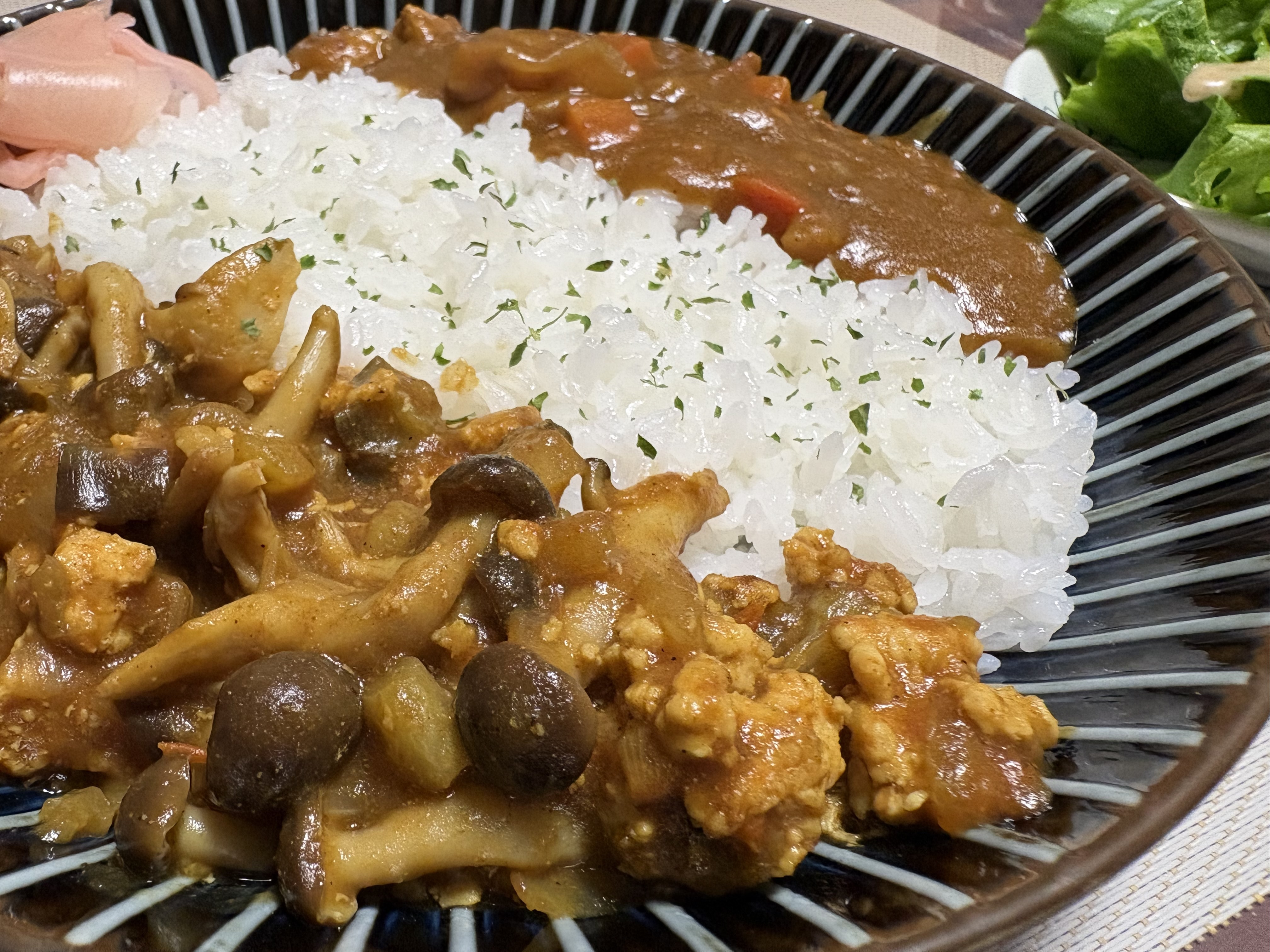 片方は鶏ひき肉、しめじ、なすなどパウダールゥで。もう片方は固形ルウで作った定番のポークカレーです☆