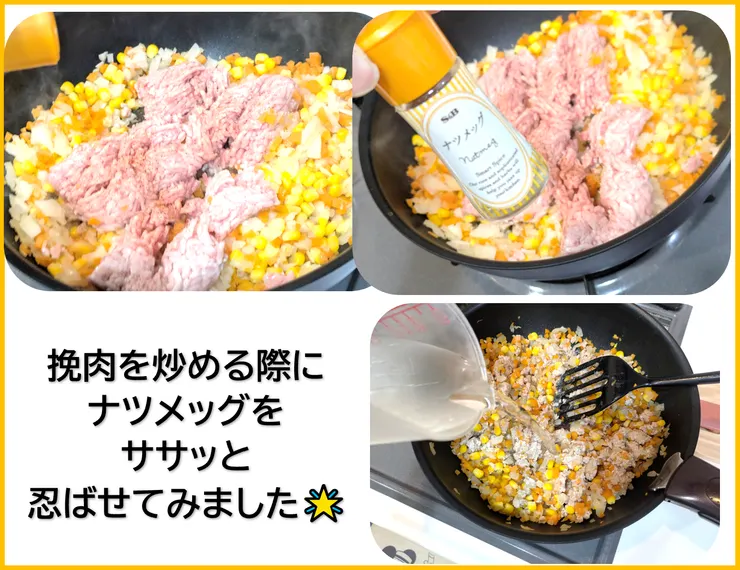 挽肉を炒める際に、S&Bのナツメッグをササッ入てみました。