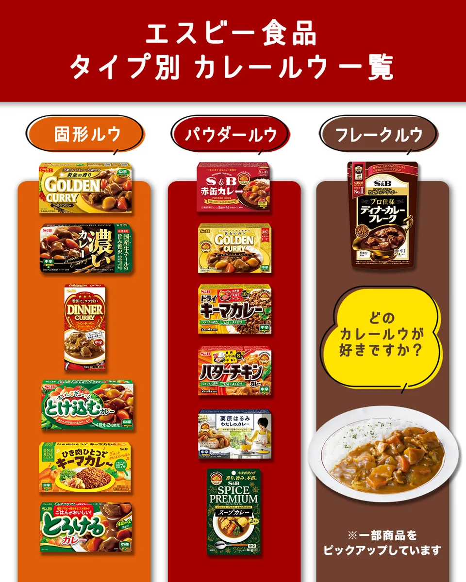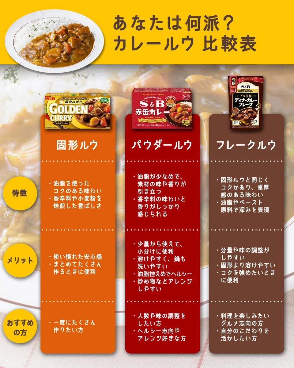 エスビー食品のカレールウは「固形ルウ」「パウダールウ」「フレークルウ」と大きく分けて3種類あります♪