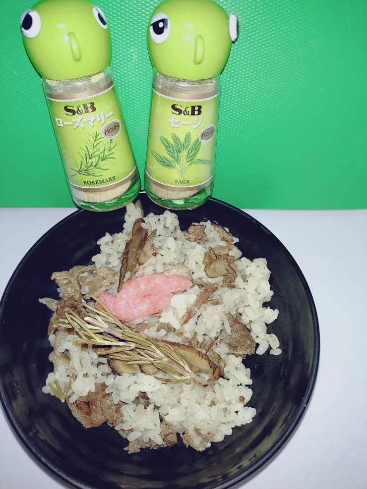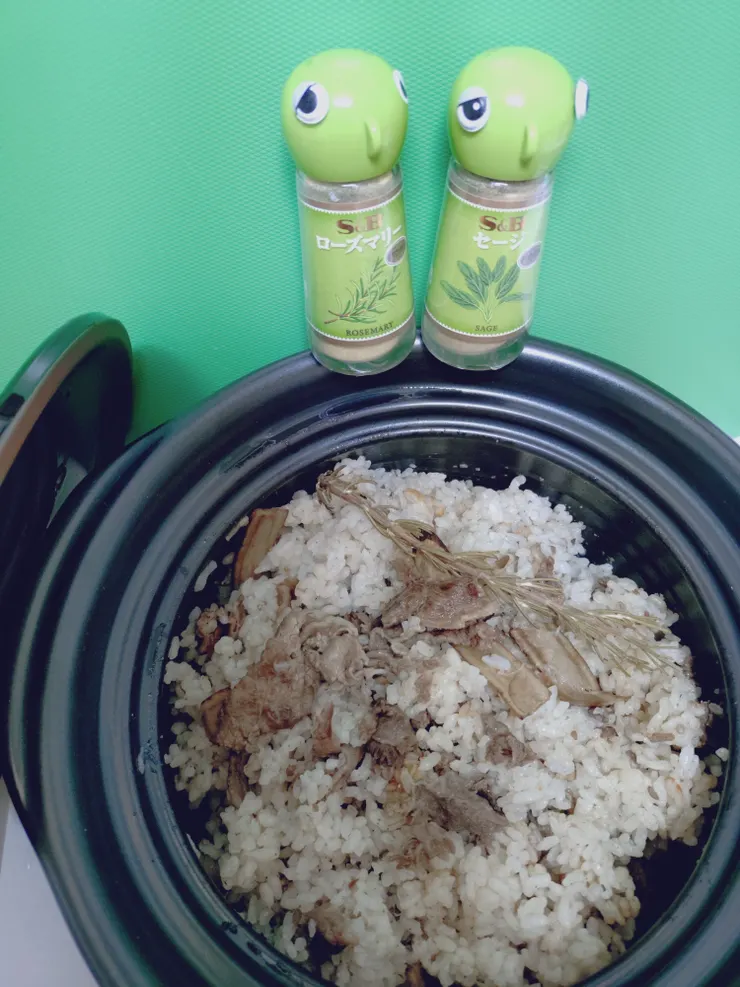 セージ、ローズマリーを使った炊き込みご飯、お肉もたっぷりで美味しそう…