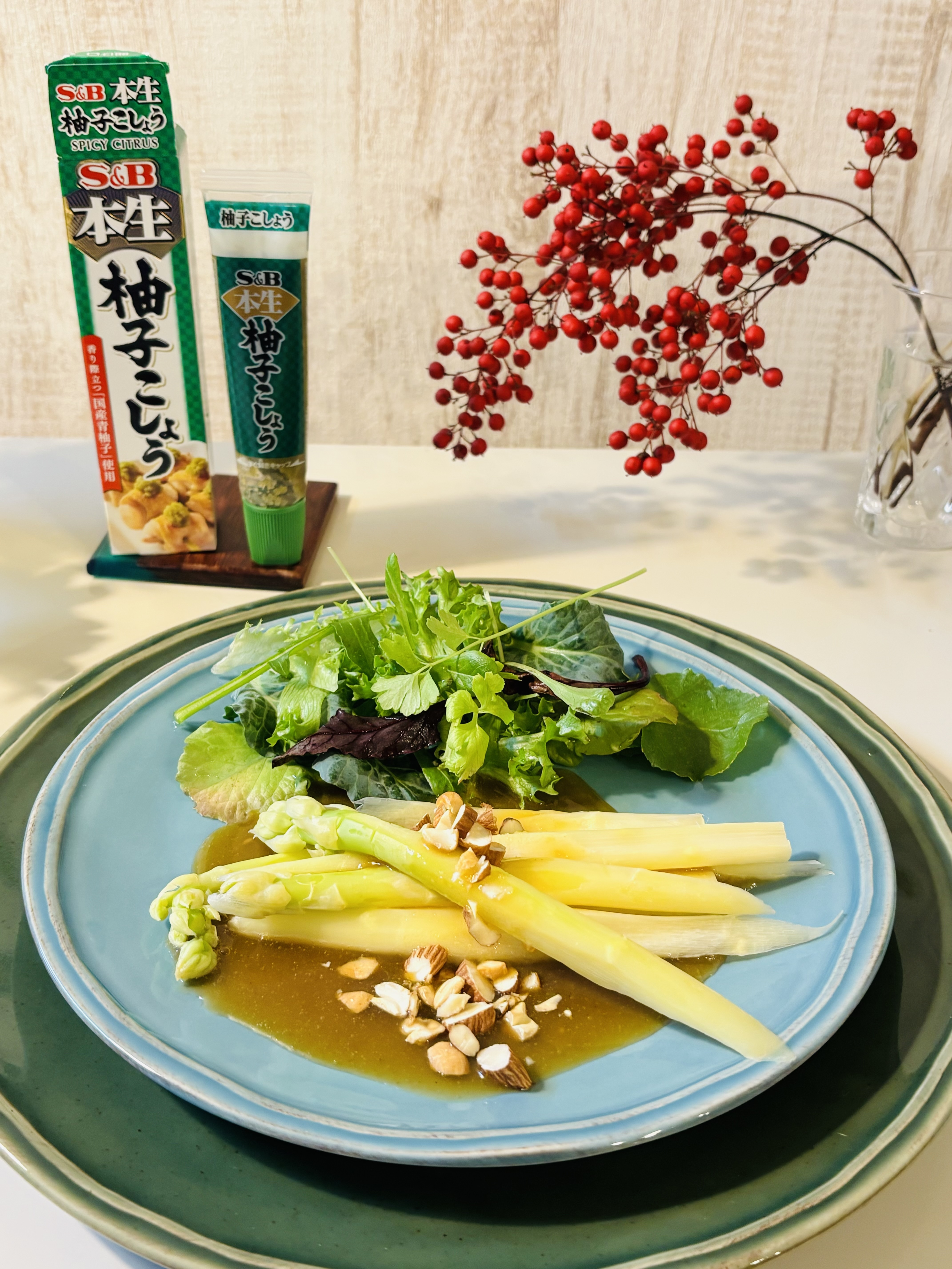 「本生 柚子こしょう」を使って、今が旬のホワイトアスパラに合う特製ソースを作りました。
