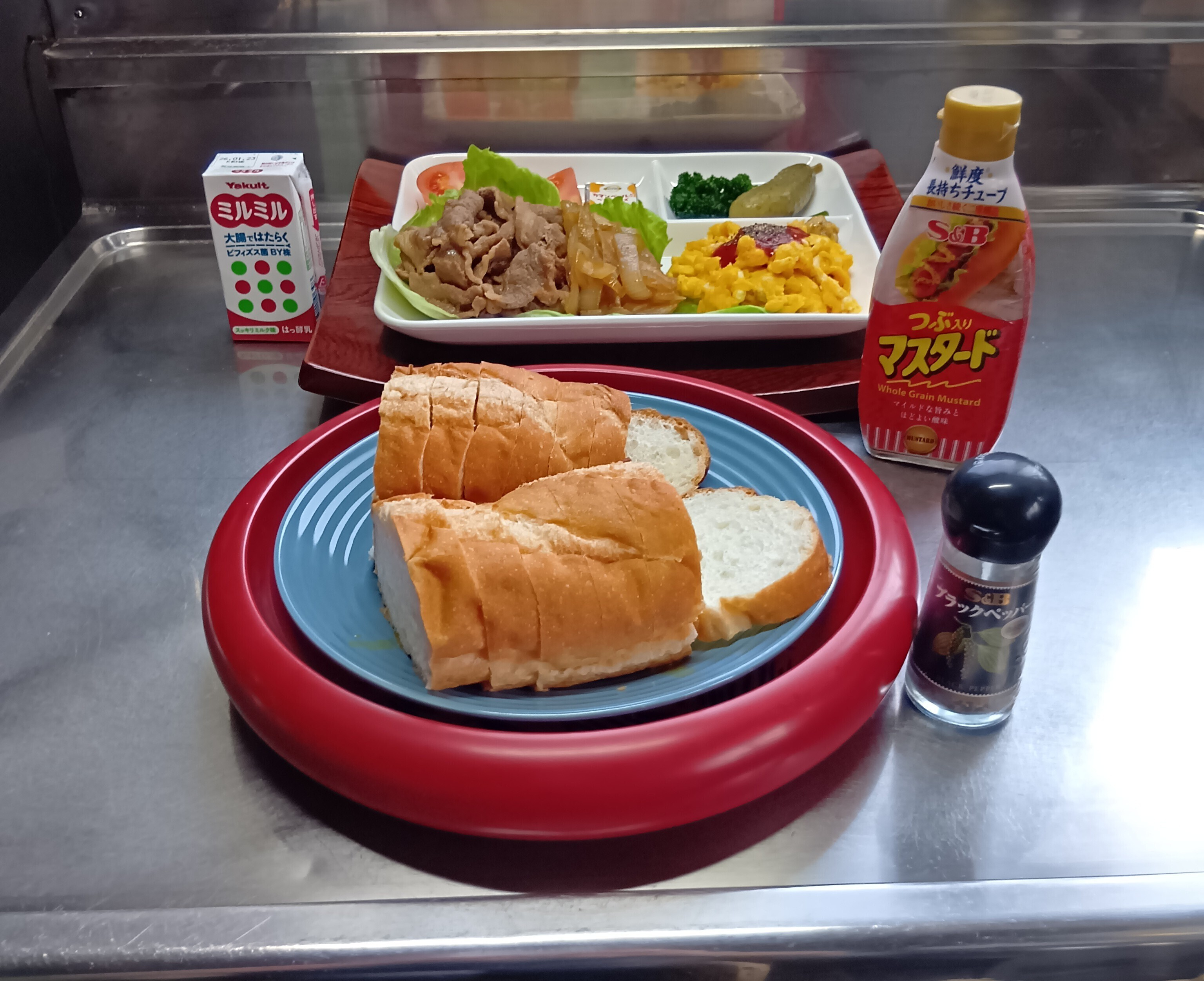 バケットと豚肉玉ねぎ酢醤油炒めとスクランブルエッグ