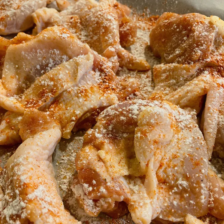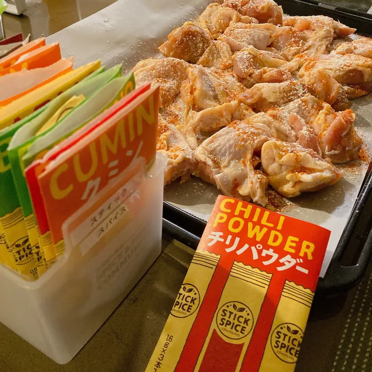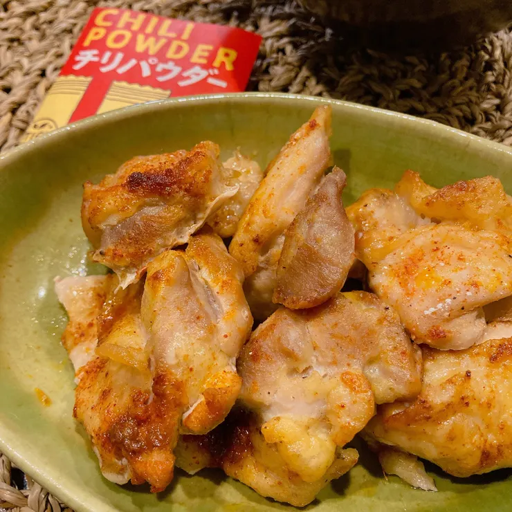 下味をつけたいつもの鶏肉(もも肉3枚くらい)に、小麦粉&チリパウダー(スティック1袋)をグリル前にサっと振りかけて、カリっと焼き上げれば完成✨