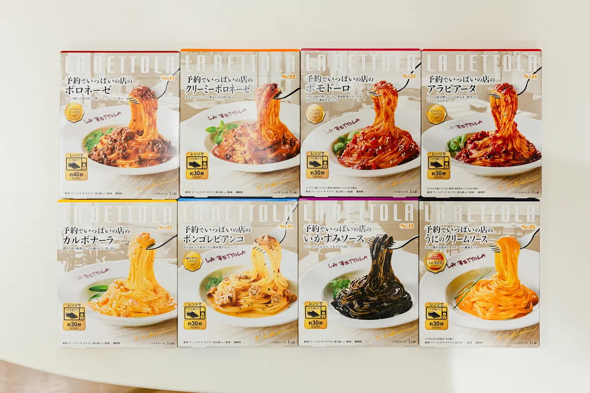 今回は「予約でいっぱいの店のパスタソース」がリニューアルされ、味わいとともにパッケージも新しくなりました。東京・銀座の有名店「ラ・ベットラ」の落合務シェフの味づくりを再現したパスタソースで、2001年の発売以来、多くの方に好評いただいてきたロングセラーブランドです。