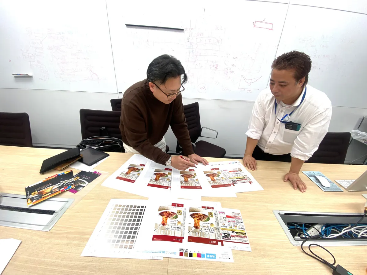 最終的なデザインが決定したら、商品やパッケージに使用する写真の撮影、印刷物の色の確認を行うための試し刷りなどの工程を経て、いよいよ完成となります。エスビー食品のパッケージは、色の鮮やかさもこだわりのひとつ。理想の色味を実現するため、最終の印刷段階では遠藤さんが実際に印刷現場へ出向き、カラーコントロールを行っています。