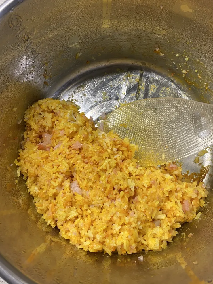 ご飯はバスマティライスをこんにゃくで増量してターメリックライスに。こんにゃくの部分は赤くなっててすご〜い。