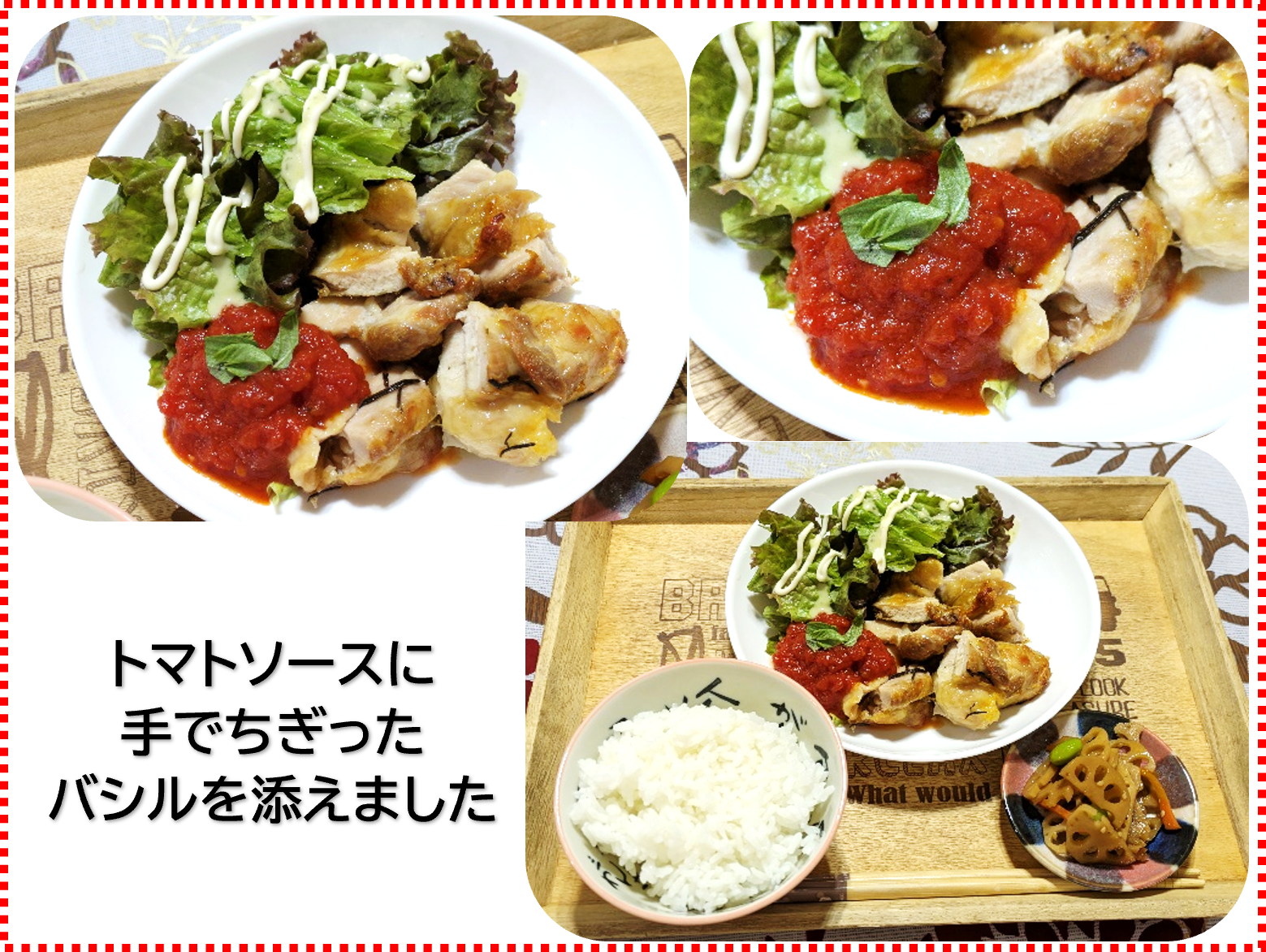 チキンにトマトソースを添え、その上にバジルものせました。