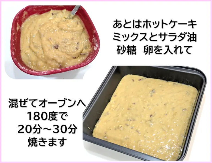 ホットケーキミックス150g サラダ油80㏄ 砂糖80g 卵2個です。