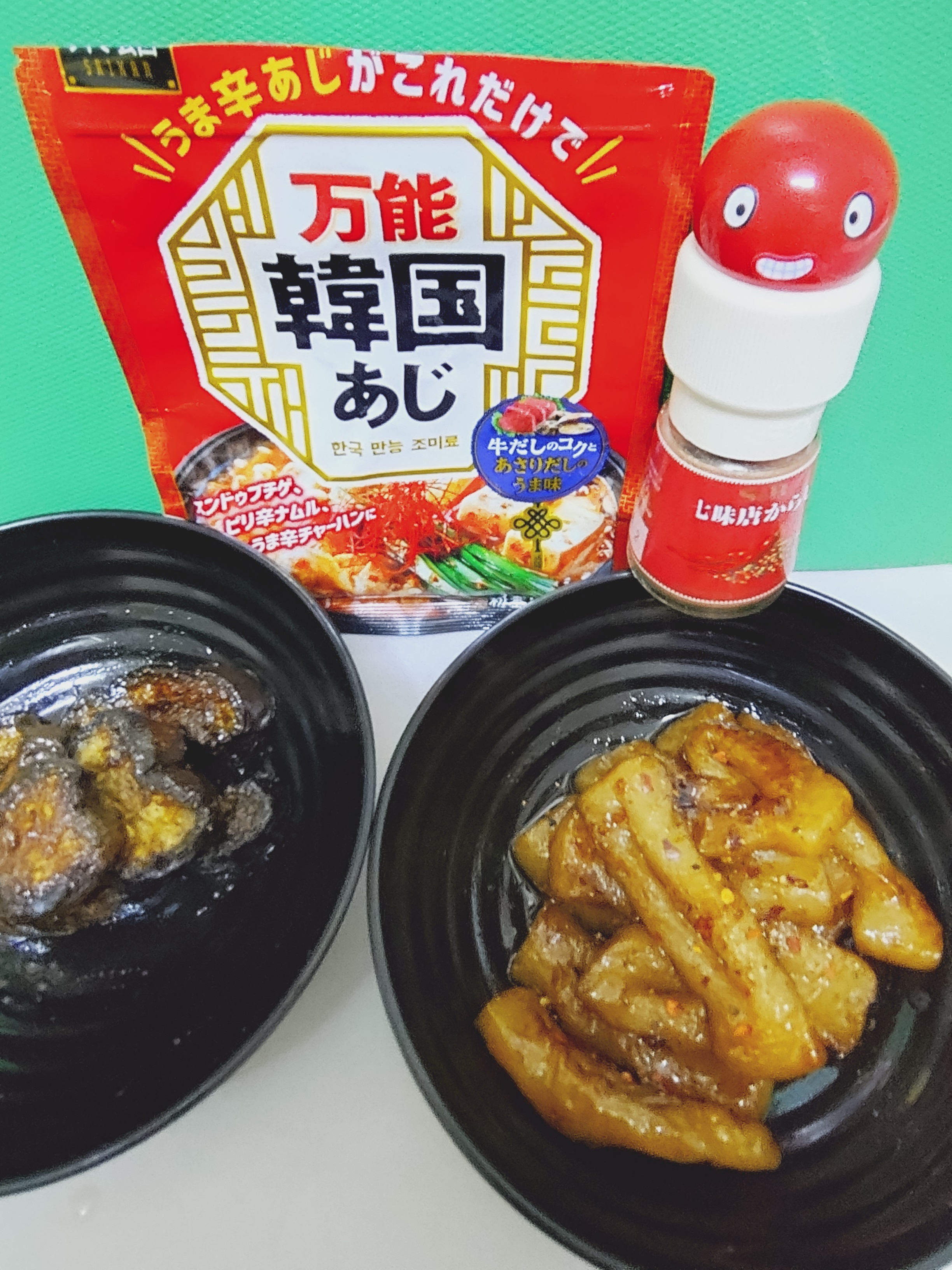 【 6 】なすとこんにゃくにタレを絡ませて盛り付けたらミル付き七味唐辛子をガリガリして出来上がり〜😋