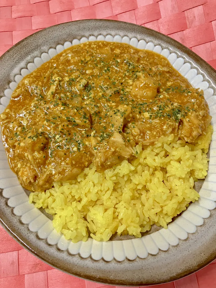 S &Bバターチキンカレールウに冷凍してあった鶏肉、トマト缶の代わりにトマトジュース、牛乳の代わりに絹豆腐、玉ねぎを加えて😉