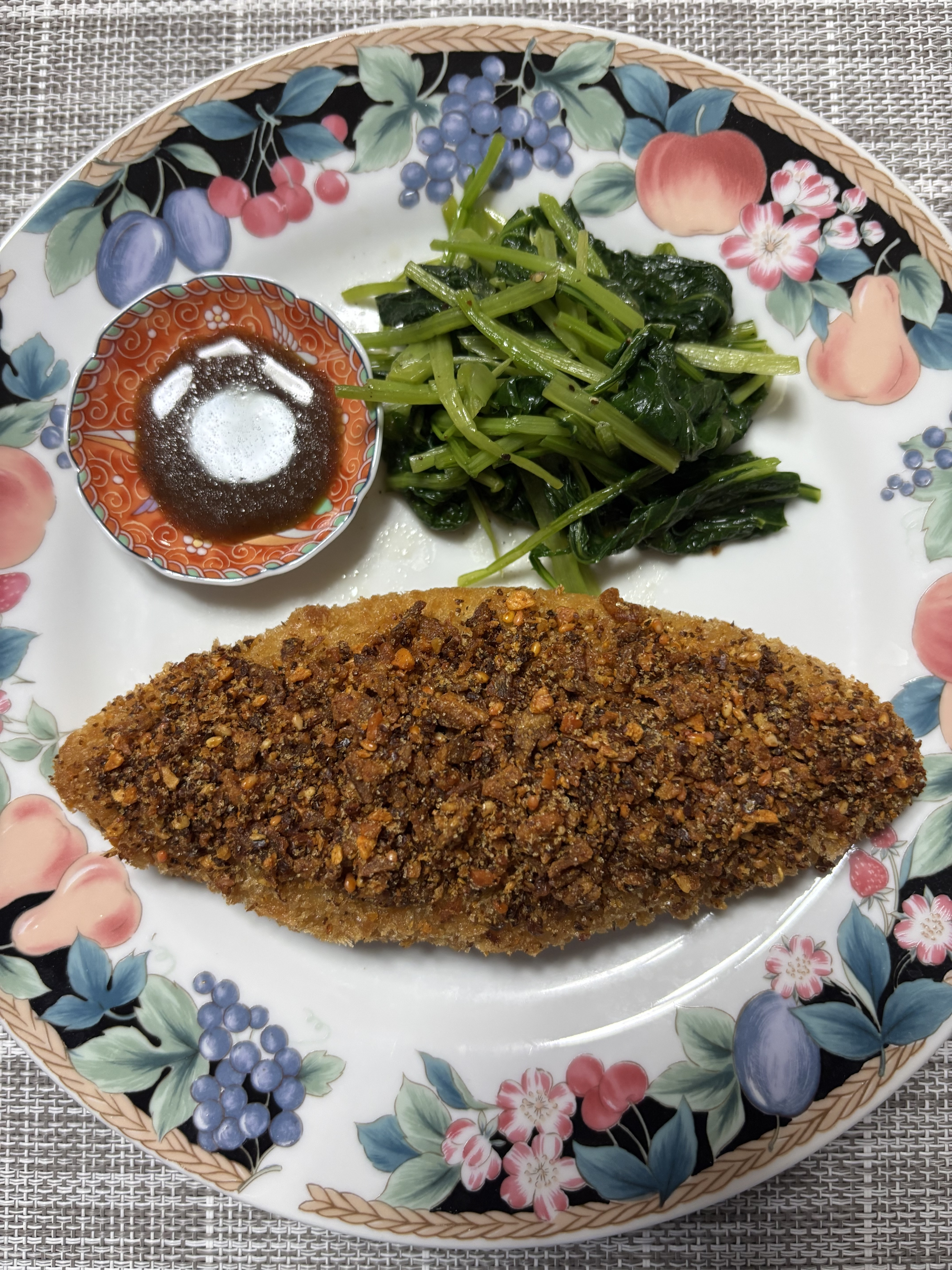 鱈切り身100g、片栗粉適量、オールスパイス適量、パン粉適量、卵1個、ほうれん草適量、塩胡椒適量、小麦粉適量、クリスピーシーズニング適量、中濃ソース適量