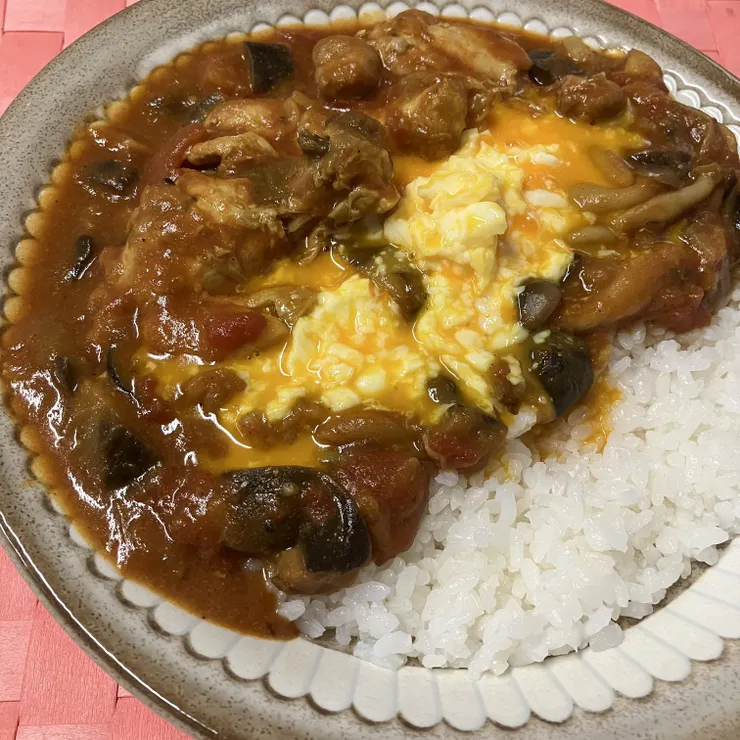 手羽元・なす🍆・しめじ🍄🟫・玉ねぎ🧅を炒め、牛乳とトマト缶🥫で煮込み、食べる直前にパウダールウを加えて作りました🍛