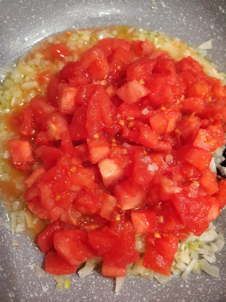 ③②に湯剥きして角切りにしたトマトを加えて、きび砂糖と塩とオレガノを加え煮る。