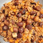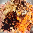 【5】フライパンにごま油をひいて、鶏ひき肉、④の具材を入れて炒め合わせ、酒、オイスターソース、醤油、砂糖、五香粉を加えて更に炒める。この時完全に火が通らなくても大丈夫。最後に甘栗も加える。