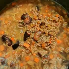 【6】炊飯器に水気をきったもち米と米を入れて、干し椎茸の戻し汁をいれ、4合目まで水を足す。