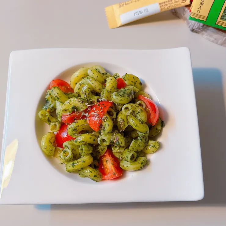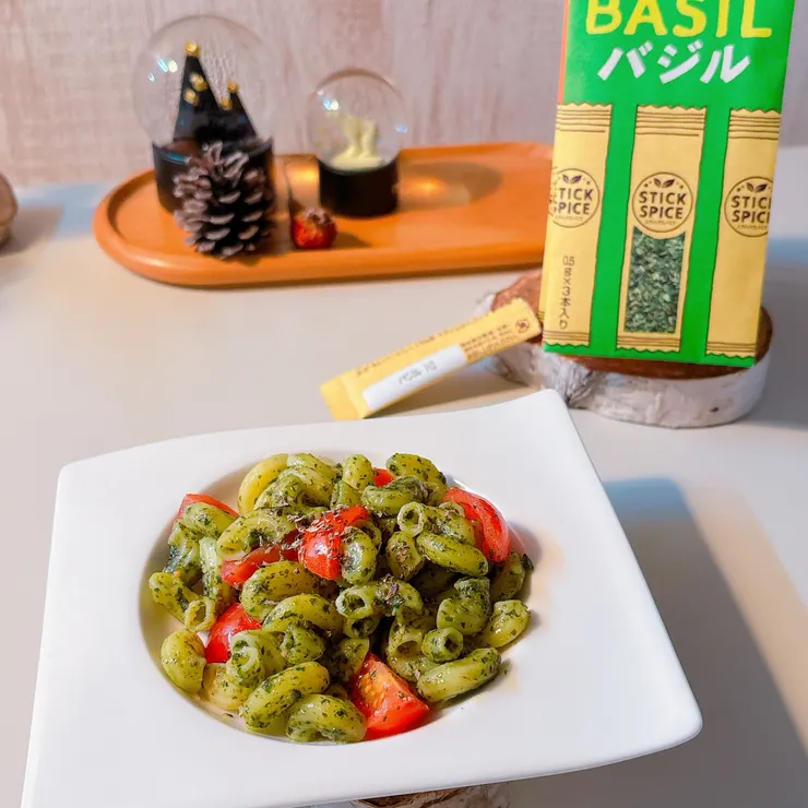 | 2.以前作ったジェノベーゼソースをほんの少し冷凍してて使用。粉チーズとお塩とオリーブオイルを混ぜて、仕上げにエスビースティックスパイス「バジル」パラリ |