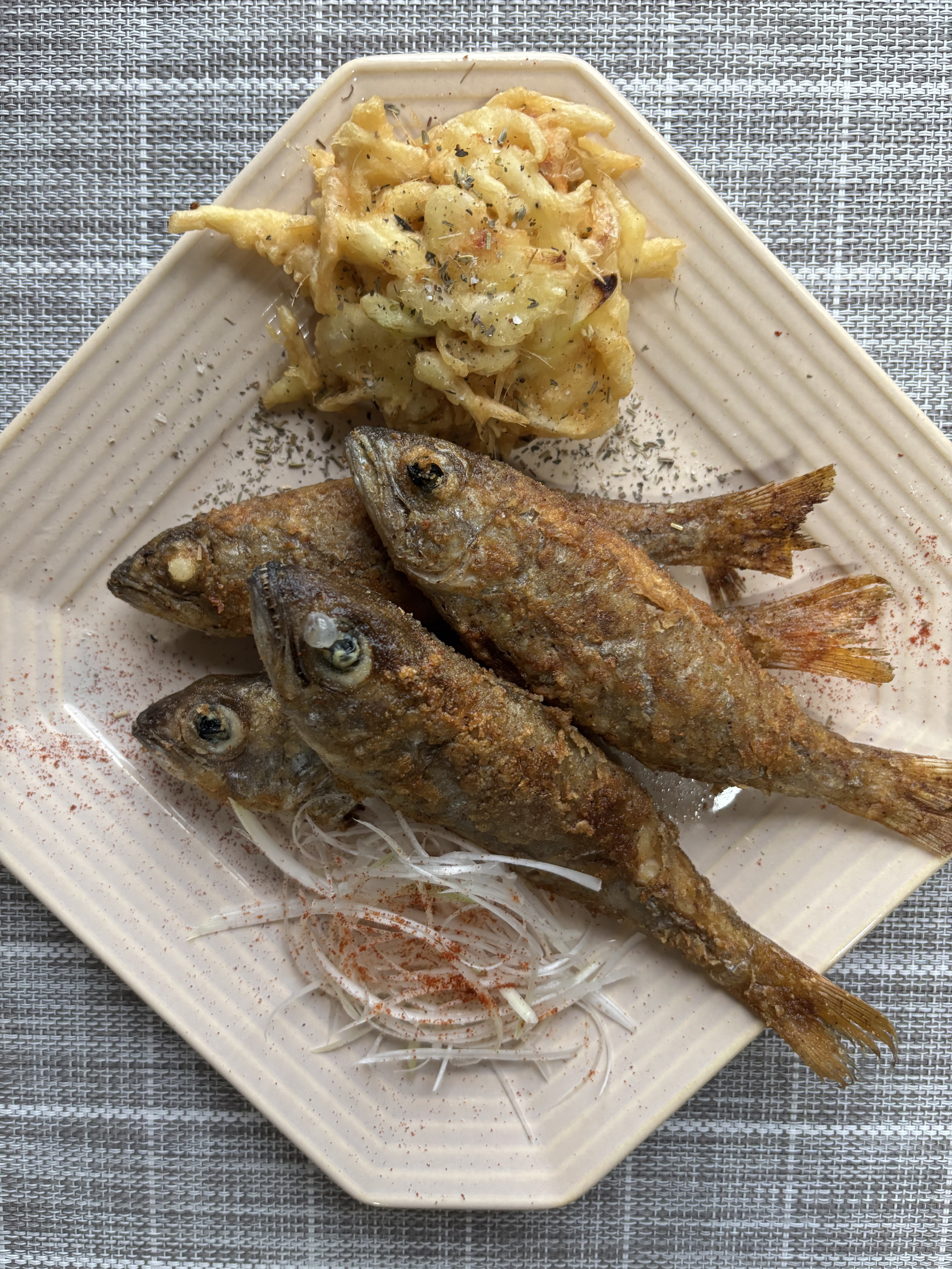 黒むつ4尾、白海老適量、小麦粉適量、コーンスターチ適量、ネギ適量、唐辛子適量、イタリアンハーブミックス適量、トリフオイル適量、ガーリックパウダー適量、塩胡椒適量