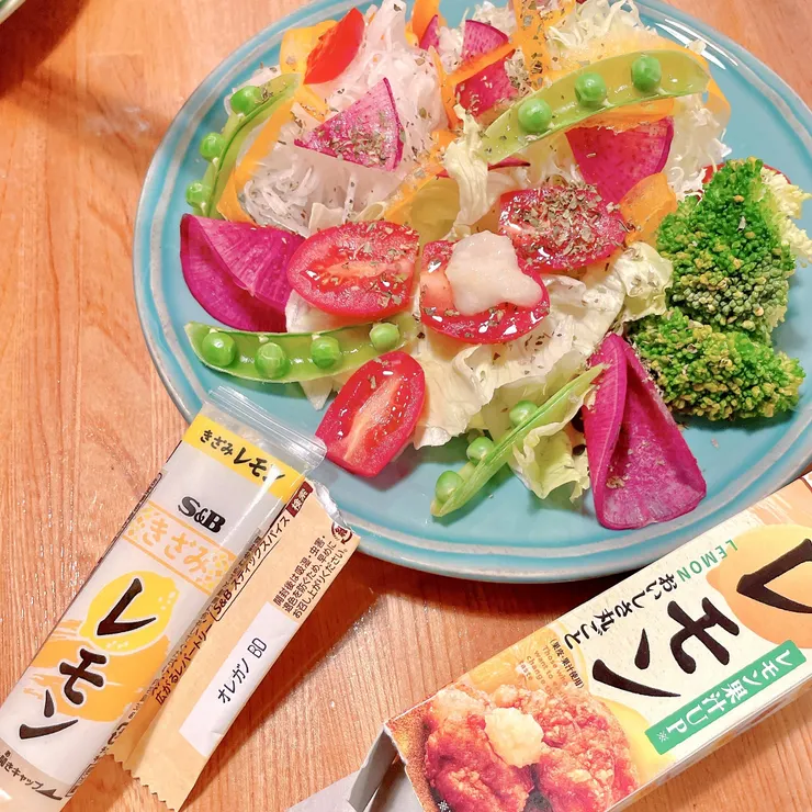 サラダには🥗「レモンチューブ調味料」と塩と「オレガノ」とアマニ油をかけました。混ぜて食べるスタイルでε-(´∀`; )