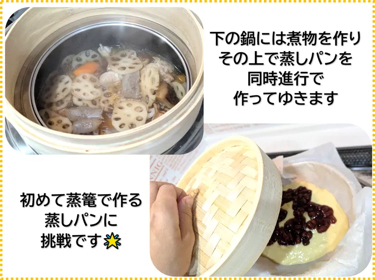 下の段で煮物を茹でて上で蒸しパンを作ってと、さすがizuみん♡さん、省エネで素敵なアイディアです😀