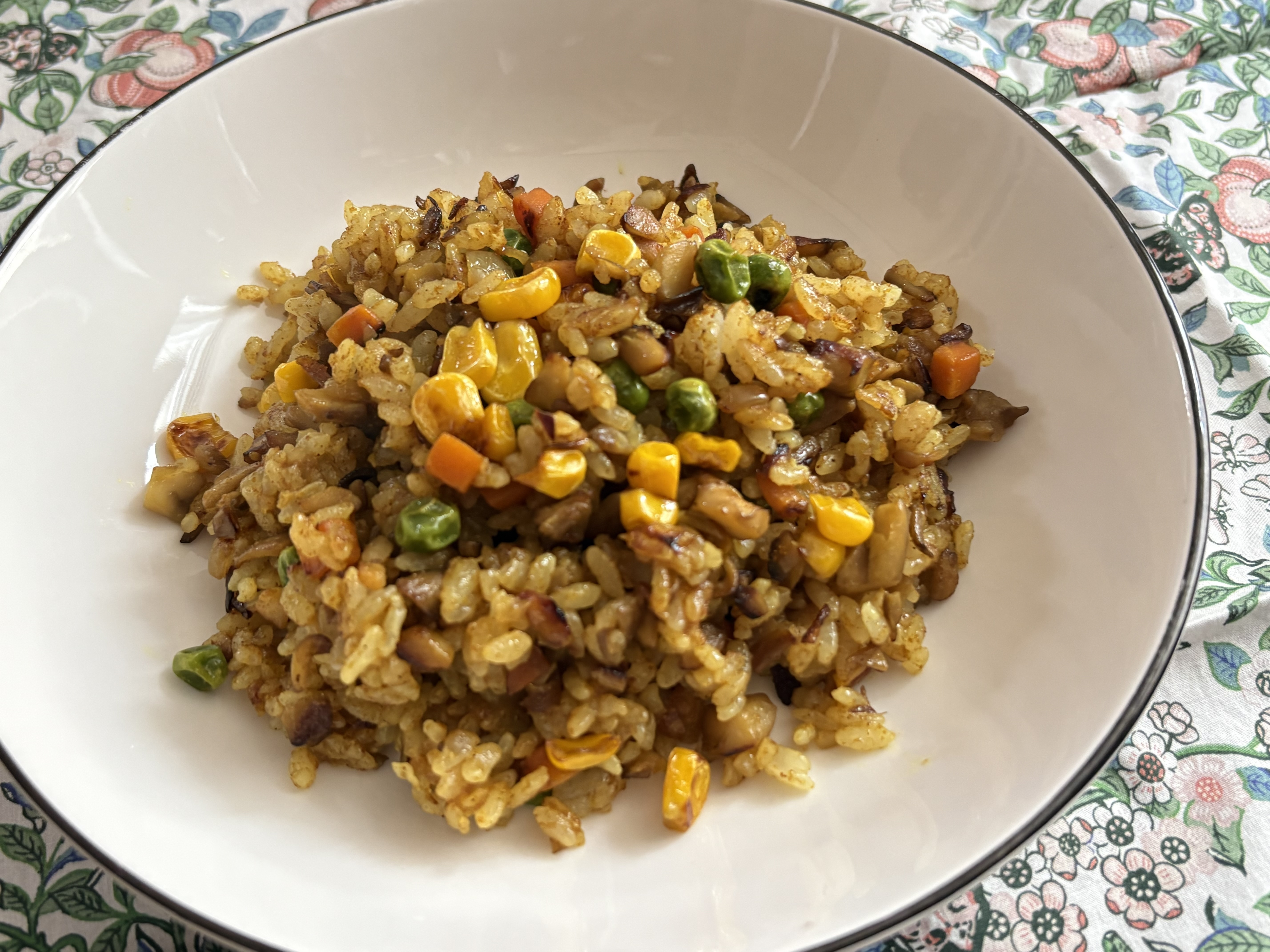 今日は冷蔵庫にずっと前からあった舞茸を食べてしまわねばと思い、細かく刻んでドライカレーを作りご飯と混ぜて焼き飯にしました。