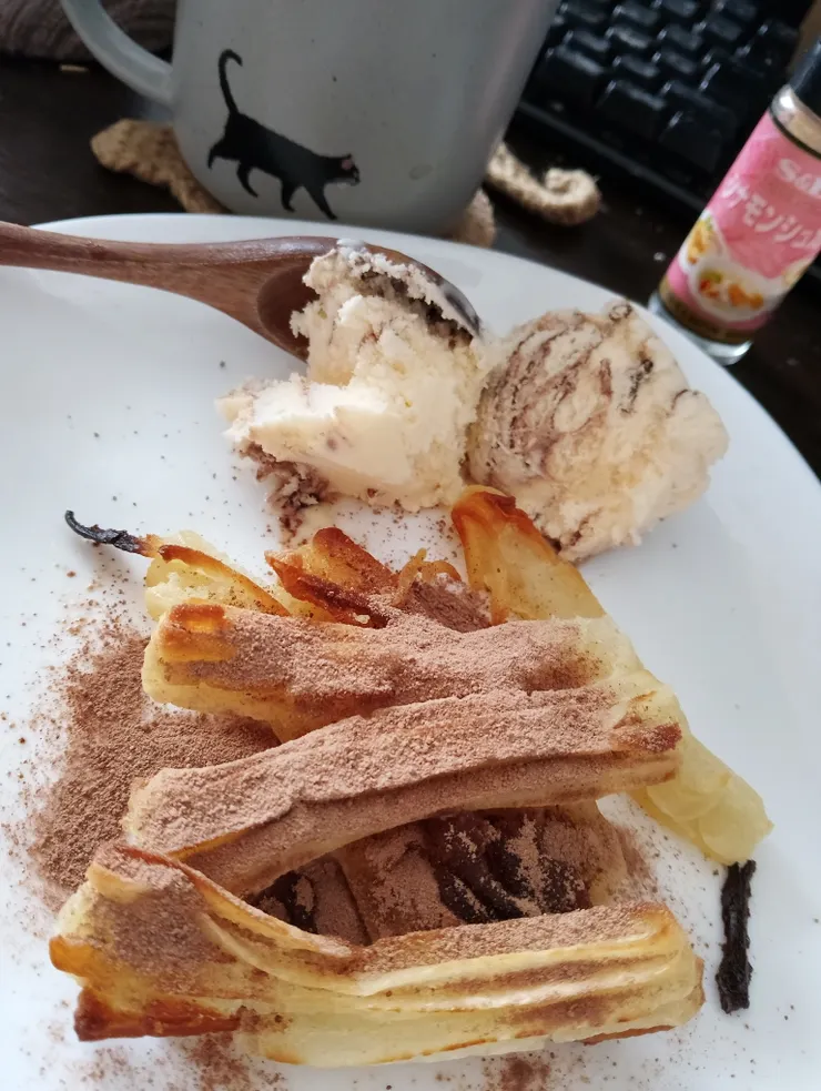 朝はさくら漬けと豆苗でヘルシーサンド。間に割れチョコとチーズを挟んだスイーツサンドを完食し、お昼時は絶妙に空腹のようなそうじゃないような⋯?という感じだったのでとりあえずチュロスで腹ごなし。