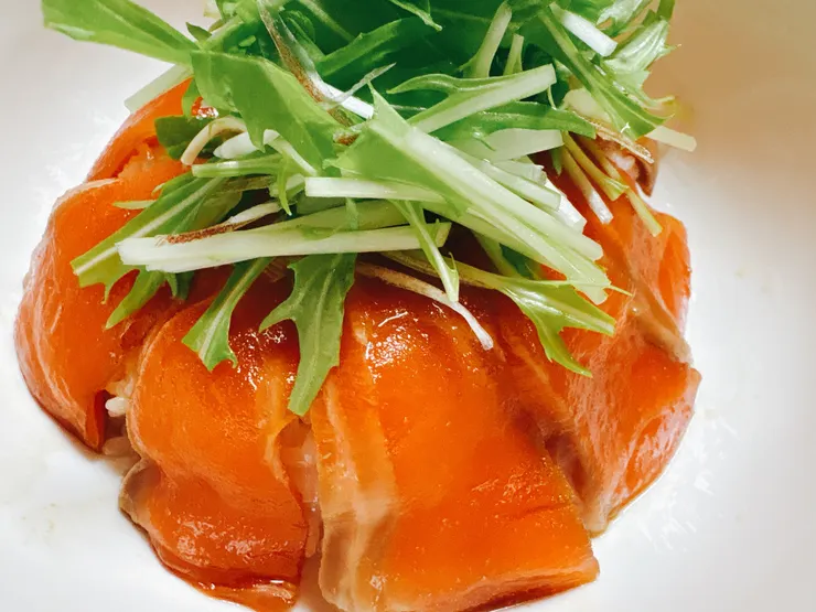 コリアンダー風味の醤油がサーモンの脂と相性がよく、とても美味しいです。