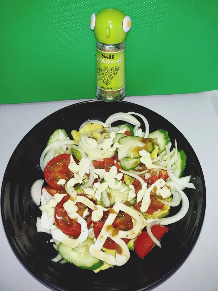 冷蔵庫に2週間前のアボカドがあるので、トマトとチーズを入れてサラダを作りました〜♡