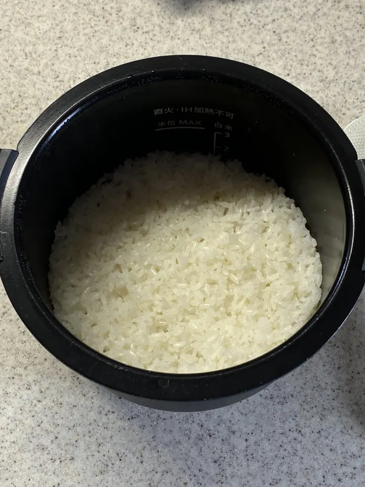 こんにゃくから水が出るので炊飯用の水はかなり少なくしてあります。