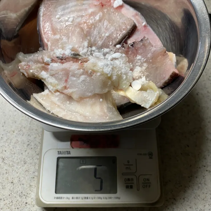 【1】鯛のカマを買ってきたら塩を1%まぶして1晩冷蔵庫で寝かす。