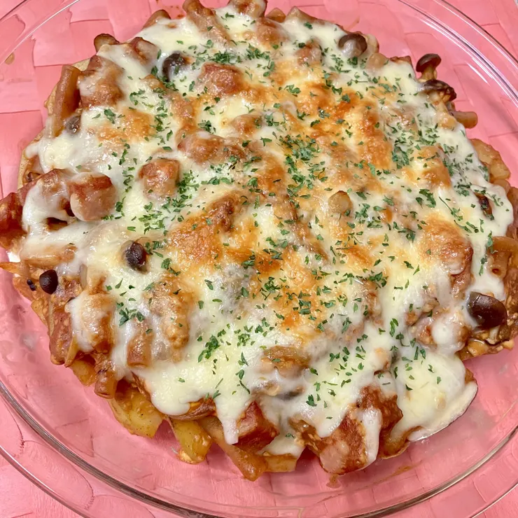 おうちにあったじゃがいもとしめじ・ソーセージ・ミートソースを使ってグラタンを作りました👩🍳