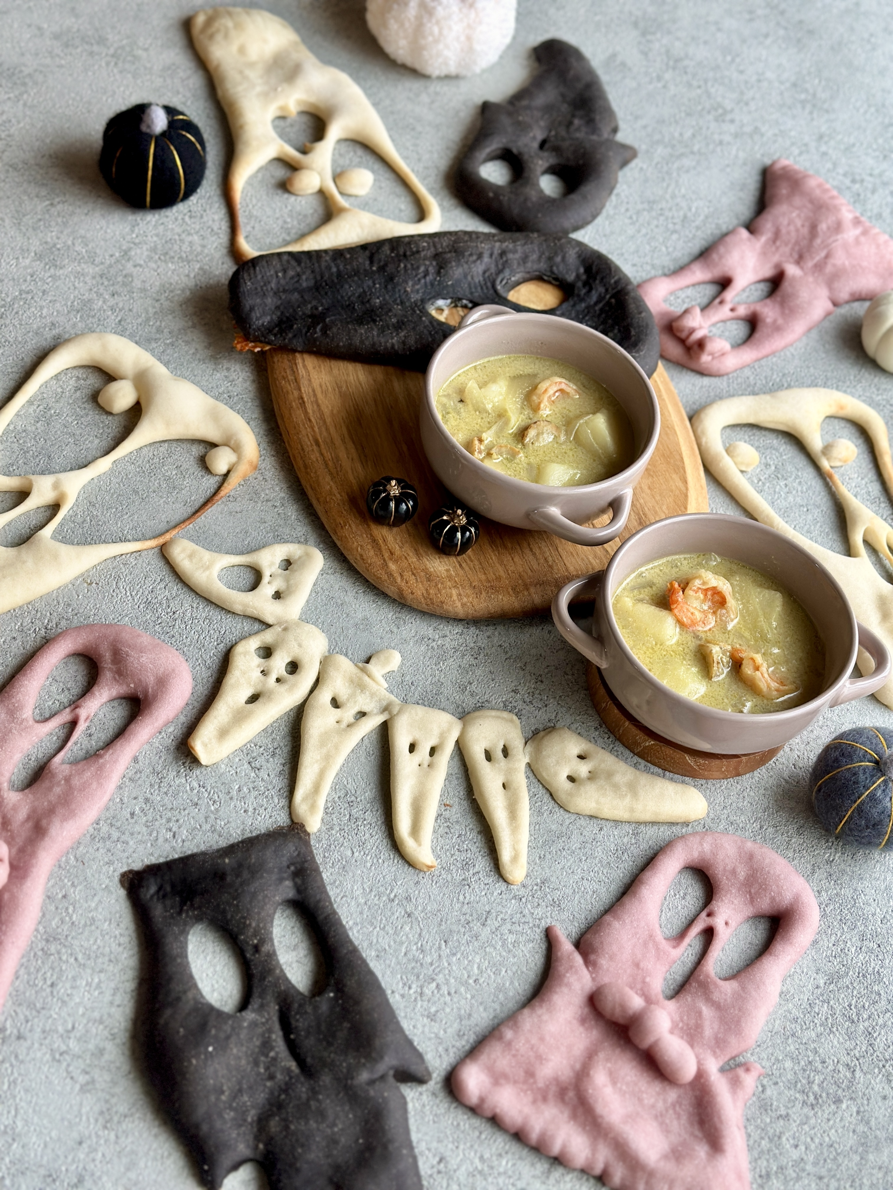 イカ墨のナンやピンクのナンが可愛い表情で思わずニッコリしちゃいました〜😄