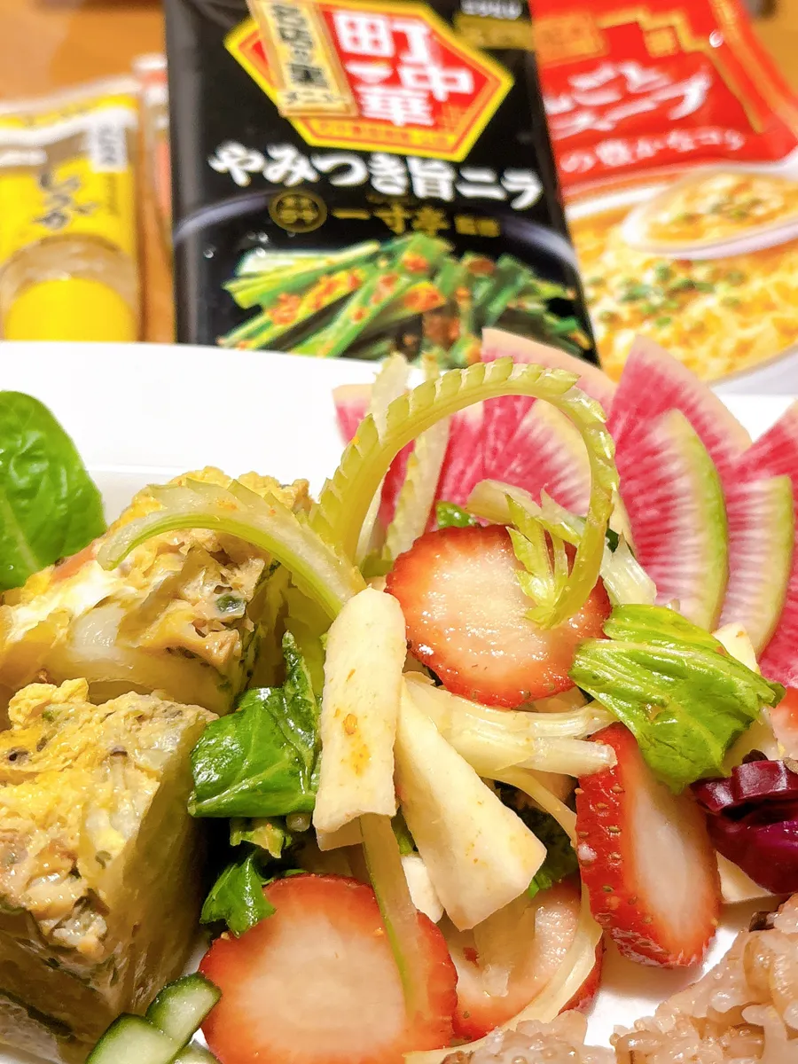 セロリと大和芋と苺とオリーブオイルで和えた