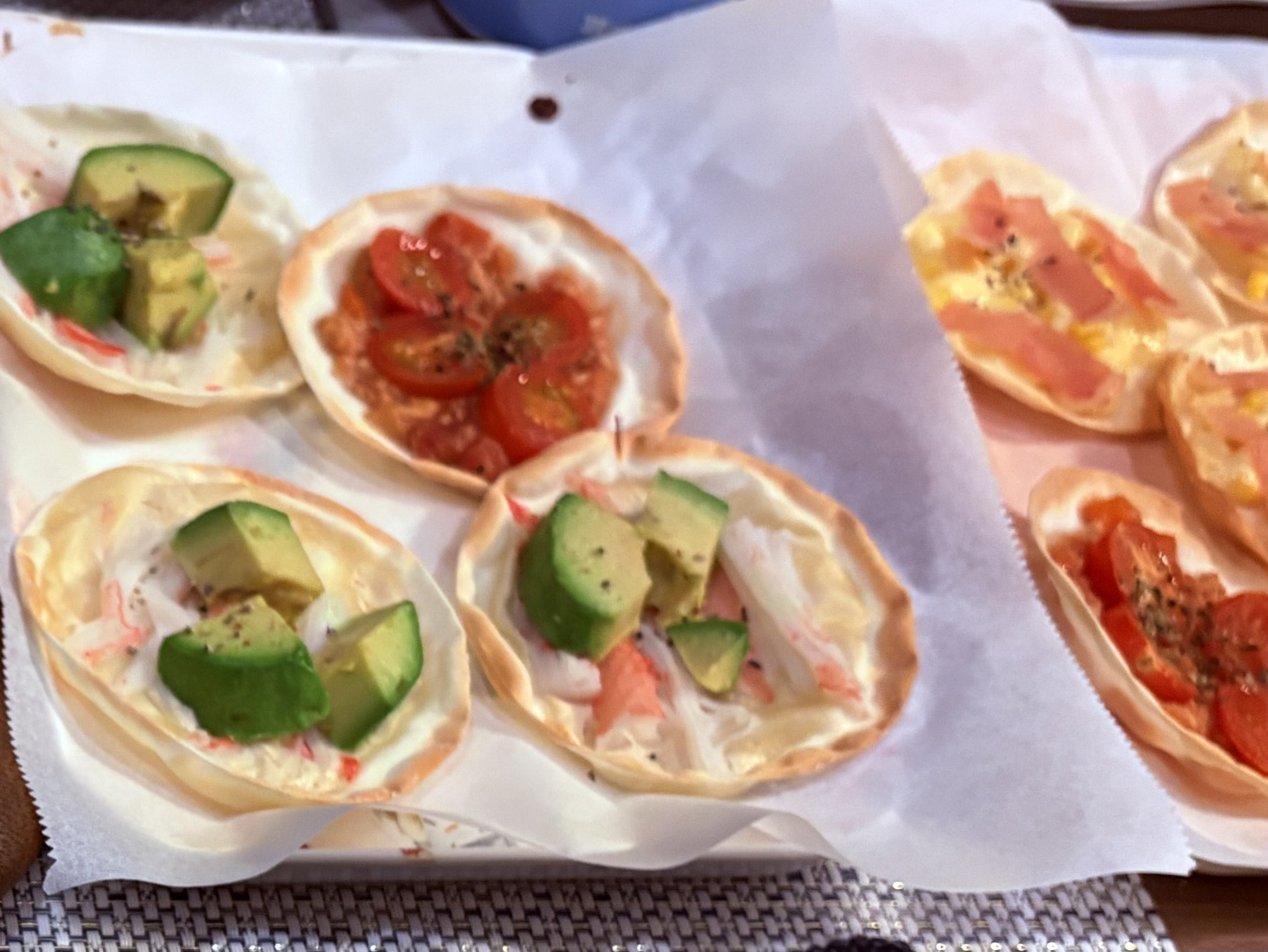 【2】具材を乗せる(カニカマ×アボカド、ツナ缶×ミニトマト、ベーコン×コーンで作りましたが、お好きな組み合わせで乗せてください)