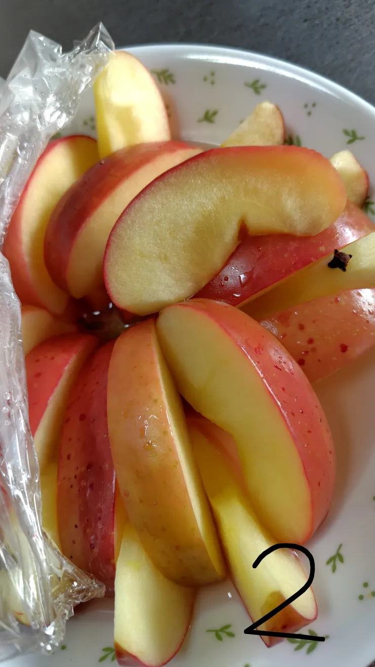 ラップをふんわりかけてリンゴ2個なら6分くらいレンチンするけど、一気にしないで途中で様子を見てね➡️透明感があるくらいレンチンすると柔らかめの仕上がりになります。リンゴの缶詰みたいにシャキっとが良かったら早めにやめて余熱で透明にするくらいがいいです 写真2