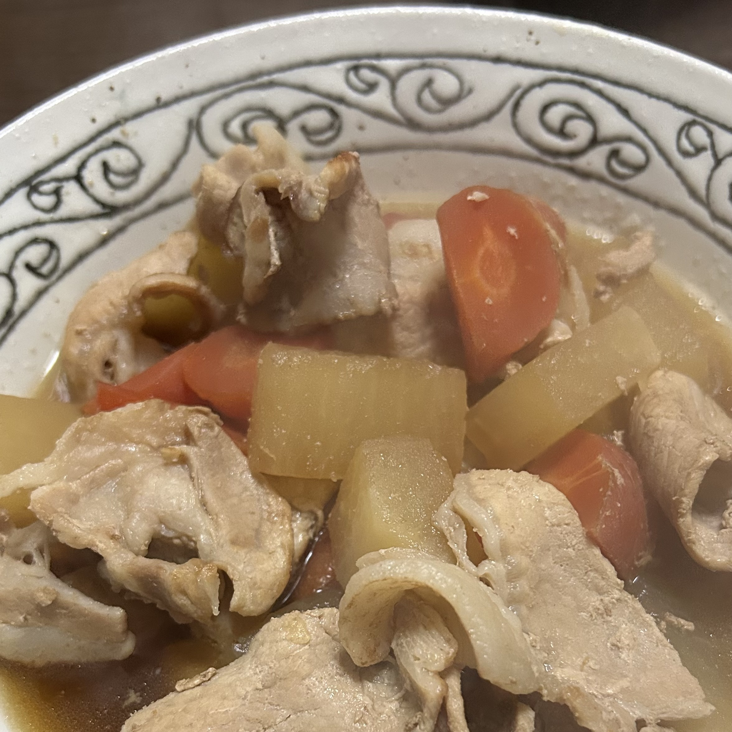 投稿を表示豚肉と大根、金時人参の煮物がほっこりな組み合わせで美味しそうですネ✨️