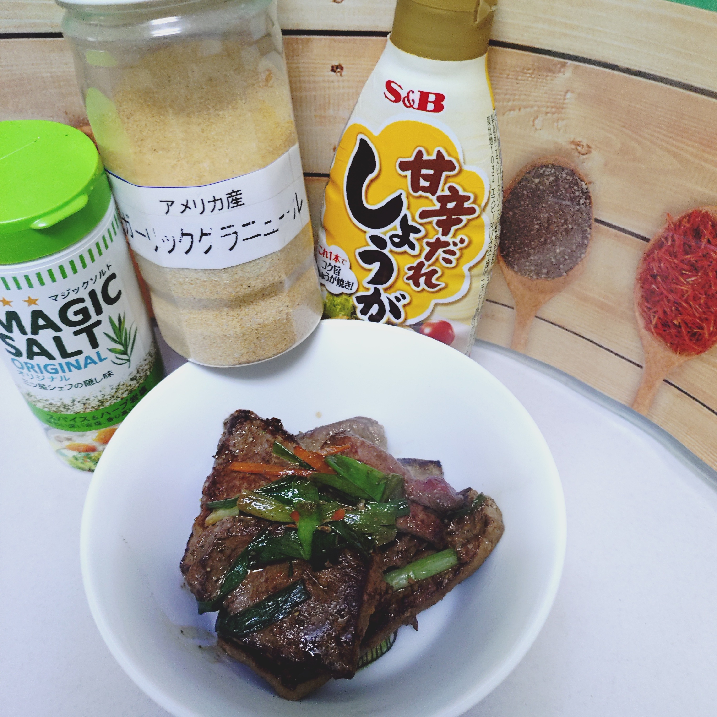 甘辛だれしょうがを大さじ1に水大さじ1で溶いたものをフライパンに入れて絡ませる