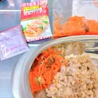 ライス(発芽米と雑穀米のブレンド)に添えたキャロットラペは、画像2枚目のエスビーシーズニングフォション「カルパッチョ」にお酢とレーズンをプラスしました