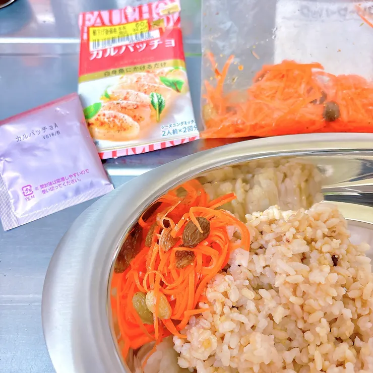 ライス(発芽米と雑穀米のブレンド)に添えたキャロットラペは、画像2枚目のエスビーシーズニングフォション「カルパッチョ」にお酢とレーズンをプラスしました
